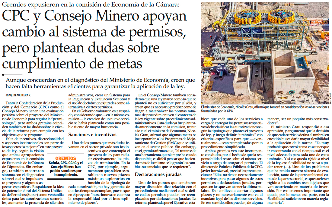 Tanto la Confederación de la Producción y del Comercio (CPC) como el Consejo Minero tienen una evaluación positiva sobre el proyecto del Ministerio de Economía para regular la “permisología”, pero ambos gremios coinciden también en las dudas sobre la eficacia de la reforma para cumplir con los objetivos que se propone.